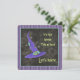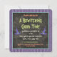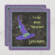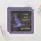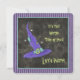 A fun square party invitation with a floating purple and teal blue enchanted witch hat that says "It's that Witchy Time Of Year, Let's Party" on a dark charcoal black background with a teal blue border. All the editable party details are on the back.