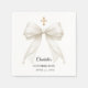 A large ivory colored bow with pearls and a golden cross as decoration. Personalize and add her name and the date,