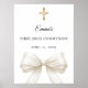 A large ivory colored bow with pearls and a golden cross as decoration. Personalize and add her name.