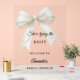 A clear, transparent background, decorated with an ivory bow with pearls. Personalize and add a name.