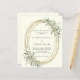 An ivory coloured background decorated with sage green greenery. A faux gold frame. Personalize and add your names and details.