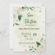 Beautiful romantic wedding save the date invitation featuring ivory white flowers and some gold leaves .
