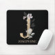 Letter J monogram floral. Letter J in golden brown texture accented with green watercolor compound leaves, flower blossoms and gold dust. Personalized with name in matching font.