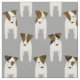 This charming Jack Russell Terriers fabric features eight cartoon JRT dogs with varied brown and black facial and body markings arranged in a tight staggered pattern - the background colour is customizable, currently medium grey - Jack Russell Terriers pattern © katz_d_zynes 2019