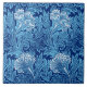 Art Nouveau, Jacobean damask pattern tile of stylized, scrolled leaves and flowers, based on a vintage William Morris textile design, digitally enhanced and coloured in light sky blue on a deep navy / indigo blue background, accented with white flowers