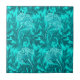 Ceramic tile in a Jacobean damask pattern of stylized, scrolled leaves and flowers, based on a vintage William Morris textile design, digitally enhanced and coloured in turquoise and deep teal, with light aqua flowers