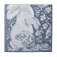 This is the bottom left tile in a four - tile small mural, or the top tile in a two-tile small mural The colours are denim blue hues with white. A curious bunny rabbit and two birds visit in this fantasy garden, inspired by Jacobean floral motifs as well as Delft, Dedham and chinoiserie antique pottery. Whimsical, unique artwork & design by Tuzi Williams.