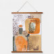 Modern abstract wall hanging with jaguar animals and organic shapes in pop art portrait style. Cool mixed media design in earth tones of golden sand beige burnt orange and green.