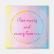Affirmation L'aimant de l'art, "J'aime l'argent et l'argent m'aime", sur un mélange de jaune, rose et bleu, imprimé en magnet.