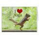 Photo amusante d'un mignon écureuil faisant une pose de yoga avec le texte "I Heart Yoga" au-dessus de lui. L'écureuil est sur la rampe en bois d'un pont à l'extérieur, en position yoga avec ses pattes devant lui, une jambe derrière lui dans l'air, et sa queue tout droit. Cet écureuil aime bien évidemment faire ses exercices de yoga à l'extérieur, entouré par la nature, avec des arbres dans l'arrière - plan. On dirait qu'il fait sa version de la salutation du soleil et qu'il est peut-être sur le point d'entrer dans la position de chien en bas. Vous pouvez faire imprimer cette jolie photo d'écureuil sur de nombreux produits différents qui peuvent être facilement customisés. Si vous aimez le yoga, et que vous pensez que les écureuils sont mignons, voici la photo pour vous !