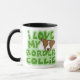 Une tasse brune extrêmement unique de border collie ! Un dessin de border collie de kawaii est du côté droit, avec la grosse impression deux-modifiée la tonalité verte l'entourant. Le texte lit, "j'aiment mon border collie." Marchandises brunes très mignonnes de border collie pour des amoureux de les chiens. Nous offrons cette conception sur un assortiment large d'autres articles, y compris des chemises. Nous avons également la couleur noire et blanche de manteau.
