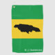 Jamaica colours green black and gold and Jamaican island golf towel. White customizable name text.