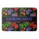 Black bathroom bathmat patterned with ackee fruit, tropical flowers and green palm leaves. Across the middle is the quote 'LOOKING GOOD' which is customisable so you can add your own wording, or delete if you prefer