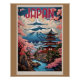 Japan travel poster, pagoda and cherry blossoms.