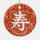 寿, the Japanese character for celebration, on a pretty red chiyogami floral. This ornament would make a lovely gift for any Japanophile, or a person with Japanese heritage.