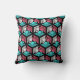 Throw pillow in a classic Japanese kimono pattern of stylized cranes, arranged in a pattern of hexagons, in coral pink, turquoise, and white, on a black background