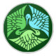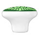 Knob in a classic Japanese kimono pattern of stylized cranes, arranged in a pattern of hexagons, in pale and medium jade green and light sky blue, on a dark jade green background