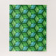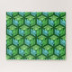 Puzzle in a classic Japanese kimono pattern of stylized cranes, arranged in a pattern of hexagons, in pale and medium jade green and light sky blue, on a dark jade green background
