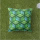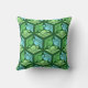 Outdoor pillow in a classic Japanese kimono pattern of stylized cranes, arranged in a pattern of hexagons, in pale and medium jade green and light sky blue, on a dark jade green background