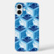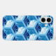 Case in a classic Japanese kimono pattern of stylized cranes, arranged in a pattern of hexagons, in navy / indigo blue, medium blue, and white, on a light sky blue background