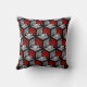 Throw pillow in a classic Japanese kimono pattern of stylized cranes, arranged in a pattern of hexagons, in deep red, light and medium grey / grey, on a black background