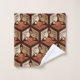 Towel set in a classic Japanese kimono pattern of stylized cranes, arranged in a pattern of hexagons, in tan, rust / terracotta, and cream, on a dark chocolate brown background