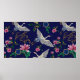 Japanese cranes, waves and flowers. Embroidery ill Poster