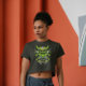 This design is a traditional Japanese demon mask, but with a futuristic, mechanical style. It is mainly green with red glowing eyes. The oni mask is adorned with metallic pipes and gears, giving it a robotic style. Its mouth is open showing its teeth giving it a aggressive tone.