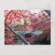 Japanese garden bridge behind red autumn maples postcard