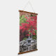 Decorate your living space with this vertical, hanging wall tapestry with wooden tops that features the photo image of a Japanese garden lantern and bright, red Japanese maple leaves during the autumn season.