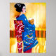 with original art design from watercolour painting by Sacha Grossel of Japanese Geisha with blue kimono and bright red obi. This beautiful design is inspired by Asian and oriental style art and has intricate details in the kimono pattern with pink and white flower patterns.