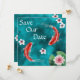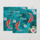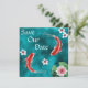 This wedding Save the Date invitation captures the oriental beauty of Japan. It has a beautiful blue water background with two Koi fish swimming surrounded by a lily pad and flowers. Koi fish symbolize love in Japan.