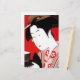 Rich, vibrant colours, including a striking red background and detailed kimono patterns.