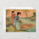 At a glance this image has the appearance of a woodblock print. Upon closer examination you will notice the graceful dot pattern of a stone chromolithograph of the Victorian period. The gentle colours and design illustrate a Japanese lakeside scene with two geishas and a boat. The willow trees and the apricot sky frame the colourful image. It is a delightful design for decor, personal correspondence and accessories. It invites your personal touch.