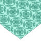 Table runner in a classic Japanese kimono pattern of stylized, four-way, medallions of leaves and flowers in deep turquoise on a soft aqua background
