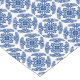 Table runner in a classic Japanese kimono pattern of stylized, four-way, medallions of leaves and flowers in deep cobalt blue on a white background