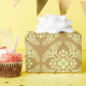 wrapping paper in a classic Japanese kimono pattern of stylized, four-way, medallions of leaves and flowers in light yellow on a deep mustard / golden yellow background