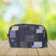 Dark blue cosmetic bag with traditional japanese sashiko printed design that resembles stiches and patches.