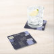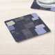 Dark blue paper coaster with traditional japanese sashiko printed design that resembles stiches and patches.