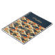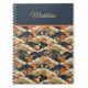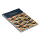 This vintage look personalized notebook features a Japanese kimono style print with white, teal, tan, and orange on dark teal-- almost black. Your name monogram, or your recipient's name, appears in gold text on a coordinated colour block of dark teal, bordered by orange.