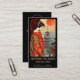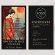 Business card featuring a beautiful elegant maiko / geisha, pagoda temples, and a big red sun - all old symbols of Japan.