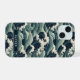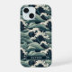 Make a statement with this iphone 15 phone case that features rolling Japanese waves in multiple shades of teal blue. It's modern yet traditional. The pattern represents surges of good luck, peace, and eternal resilience. It becomes uniquely yours with your name in a CAP font in white on dark teal.