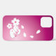 Un Coque iPhone 12 très mignon avec une illustration de deux fleurs de sakura, deux lapins à neige japonais et quatre pétales de fleurs de sakura contre un arrière - plan violet.