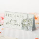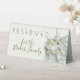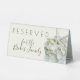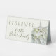 Signes de table réservées pour une réception de mariage. Le design Starfish et hydrangea est blanc avec du texte foncé imprimé et écrit à la main. Inclure à qui la table est réservée pour aider les invités. Tout le texte et la conception seront imprimés sur les deux côtés de ces courtes tentes horizontales en plastique. La palette neutre, sur le thème de la plage, fait partie de la ligne design Seaside Garden.