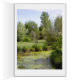 Typical public French jardin, with wooden benches, trees, flowers, pond.