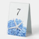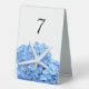 Des panneaux de numéro de table en plastique tentés et hauts. Blanc avec hydrangées bleues et le design de l'étoile de mer et nombre modèle en haut. Le design et le numéro s'impriment sur les deux côtés de sièges de table de 4 x 6 pouces.