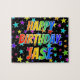 This lively and fun birthday-themed jigsaw puzzle design features the message "HAPPY BIRTHDAY, JASE" with the characters having a colourful rainbow spectrum inspired gradient pattern, along with a vibrant stars background pattern. A colourful puzzle like this might be a fun way to acknowledge the birthday of somebody named Jase. [~Z0000468]