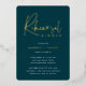 Invite guests to celebrate the happy couple with these modern and minimal rehearsal dinner invitations with luxe foil accents. Simple design features "rehearsal dinner" in casual gold foil handwritten script, with your event details beneath on a dark jewel tone emerald green background.