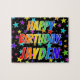 This vibrant, exciting, birthday-themed jigsaw puzzle design has the message "HAPPY BIRTHDAY, JAYDEN" with the characters having a colourful rainbow spectrum inspired gradient pattern, in addition to a fun stars background pattern. A vibrant puzzle like this might be used to send a birthday greeting message to somebody named Jayden. [~Z0000468]