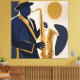 Feel the soul of jazz in this vibrant illustration. A musician with impeccable style, wearing a wide-brimmed hat and dark blue suit, brings a golden saxophone to life that seems to emit visual notes. The fluid shapes and warm color palette create an atmosphere of lively performance, capturing the cool and captivating essence of music in a single image.